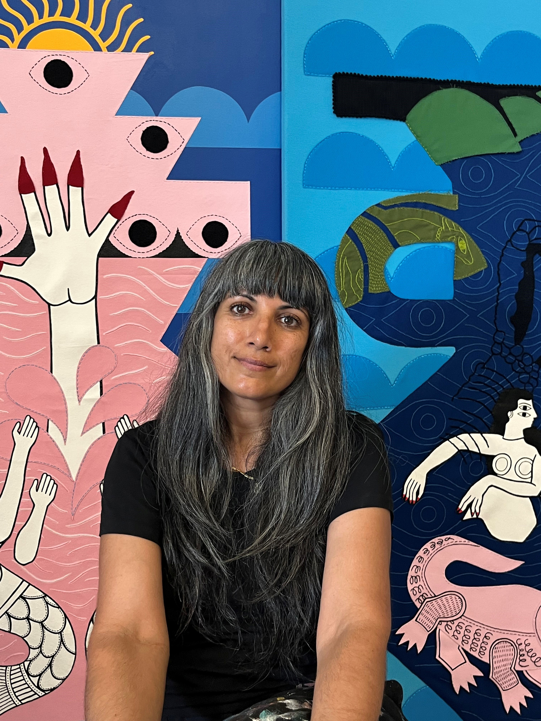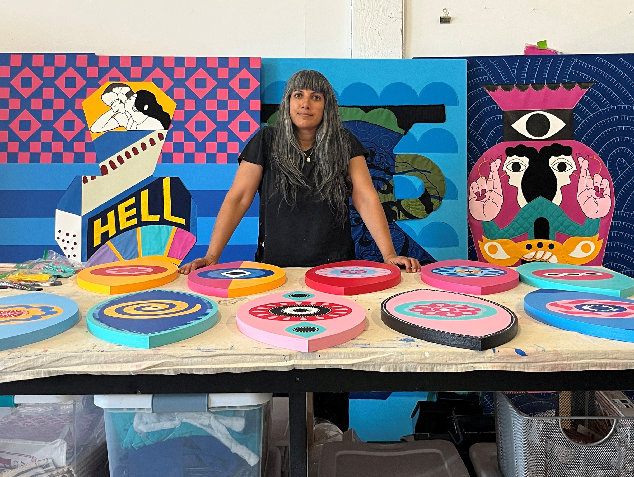 “Through painting, collage, textiles, and a large mural, Sandeep Johal uses her signature Indo-folk feminine aesthetic to confront the harsh realities of the female experience,” says Christine May, Curator at the Gallery. “She accomplishes this while infusing her work with vibrant colour, delight, and a triumphant or hopeful tone.”