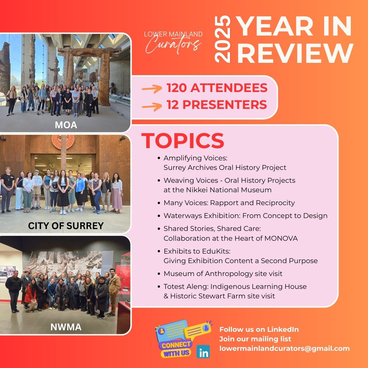 Lower Mainland Curators Group had our busiest year yet in 2025 with three in-person meetings, one virtual meeting, and one in-person social! Thank you to all our presenters, attendees, venue hosts, and supporters - we are a 100% volunteer group of museum workers learning from and teaching each other.