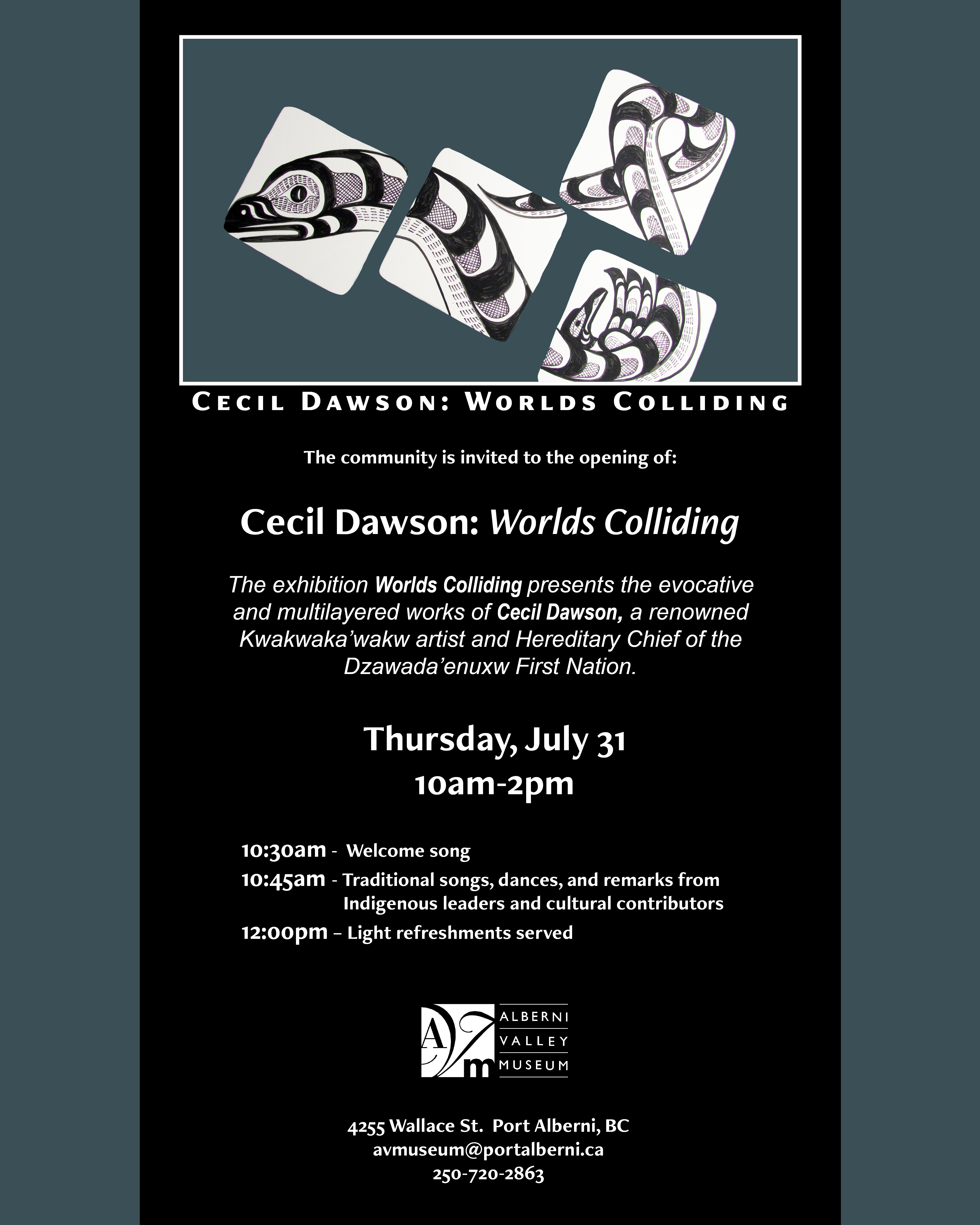 Please join the Alberni Valley Museum on Thursday, July 31st from 10am-2pm for the opening of Cecil Dawson: Worlds Colliding.
