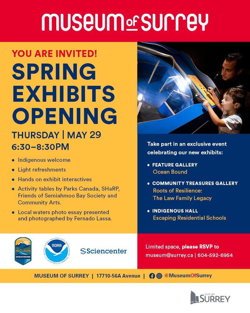 You are invited to the Museum of Surrey Spring Exhibits Opening on Thursday, May 29th from 6:30pm-8:30pm.