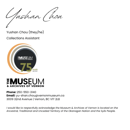 If you are interested in a transfer of any of the objects, and if you have any additional questions or inquiries, please email yu-shan.chou at vernonmuseum.ca<mailto:yu-shan.chou at vernonmuseum.ca>. Shipping costs are to be covered by the receiving institution. Thank you, and have a great rest of your day!