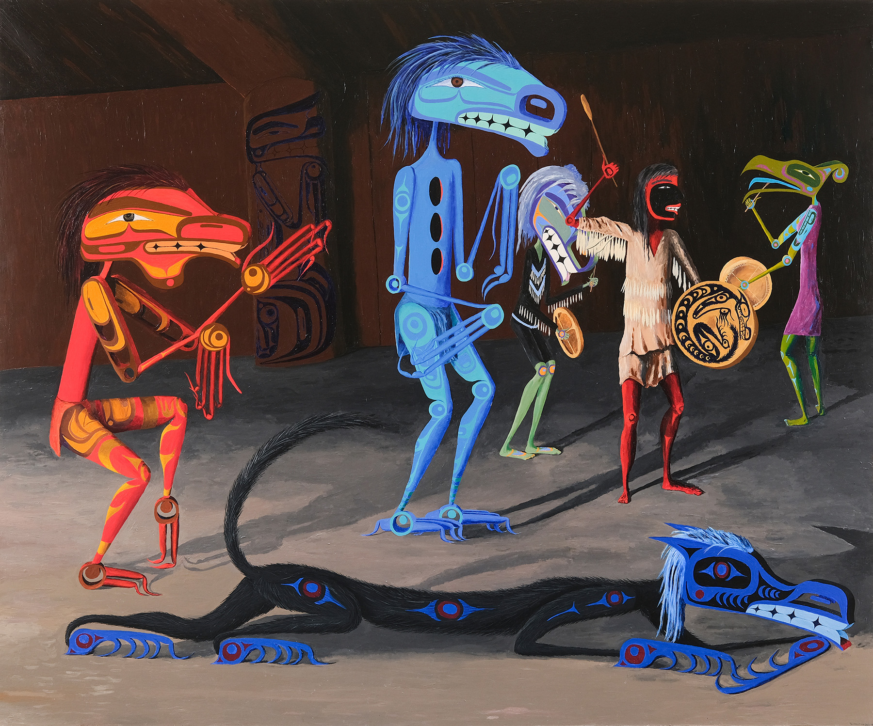 Lawrence Paul Yuxweluptun Lets'lo:tseltun, Rainy Cowichan winter Ceremony in the Longhouse, 2004, acrylic on canvas, 92 x 76 in. Courtesy of Macaulay + Co. and the artist. Photo: Byron Dauncey