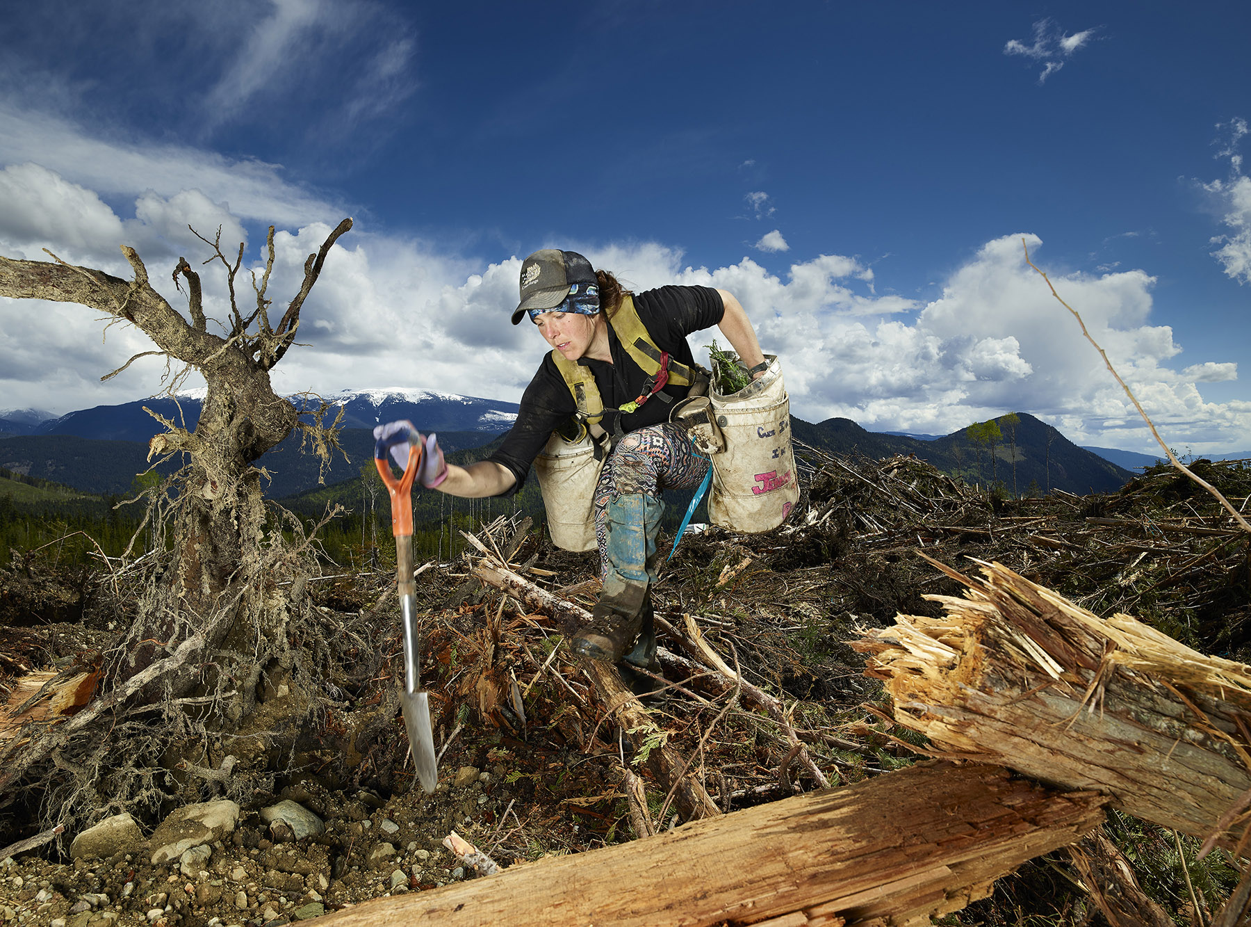 The Tree Planters by Montreal-based photographer and filmmaker Rita Leistner focuses on the physical labour required to restore damaged landscapes. Leistner's large-scale photographic portraits capture tree planters at work in remote forests across British Columbia, balancing on fallen logs, carrying shovels and bags of seedlings, while navigating terrain shaped by logging and increasingly by wildfire. Leistner brings a deeply personal perspective to the series, having spent a decade working as a tree planter herself and planting more than half a million trees.