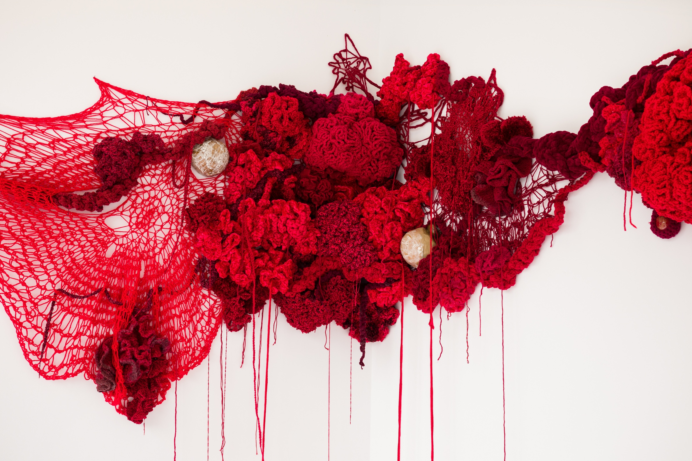 Working in a deeply personal vein is Malina Sintnicolaas, whose hyperbolic crocheted sculptures embody organic forms — manifestations, transmutations, or “petrifications” of emotions. Drawn to tactile materials and working with embodiment and emotional energy, her latest work The Red Queen articulates her relationship with experiences of depression, trauma, and anxiety.